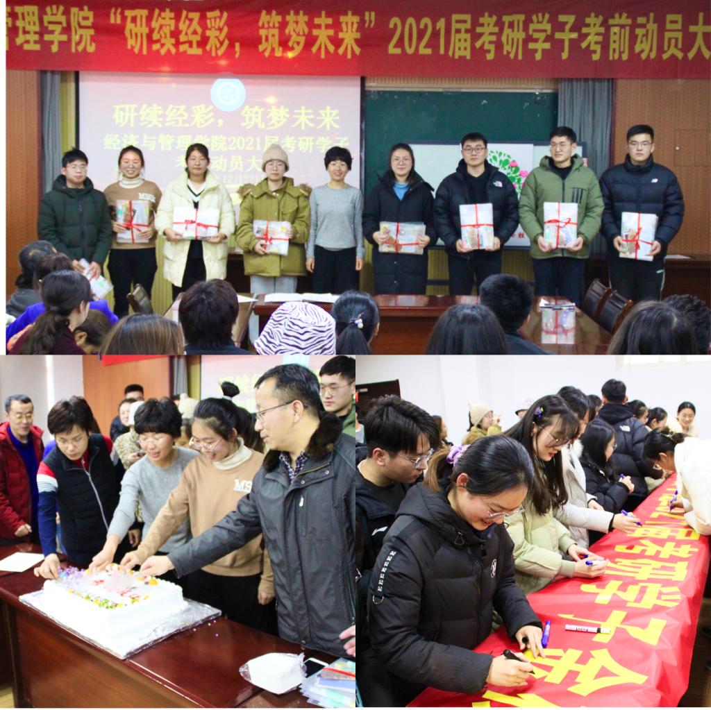 12月22日下午,9001jcc金沙以诚为本“‘研’续‘经’彩,筑梦未来”2021届考研学子考前动员大会于经管楼419正式召开。9001jcc金沙以诚为本副院长宫攀、各系主任、2017级辅导员及考研学生代表参加动员会。会上,各专业考研学生代表依次汇报了近期复习状态及备考情况,学生们从报考院校专业、复习历程、心理状态、学习方法等角度进行汇报,与会老师分别为考研学生做考前动员和祝福,从复习建议、心态调整、精神砥砺等角度系统做出具体指导。同时,学院还为全院300余名考研学子赠送“考研加油包”、准备“祝福蛋糕”,以考试专用文具、专属定制照片、温馨祝福帖等细节服务打造坚实后盾保障,助力学子旗开得胜、勇折桂枝。