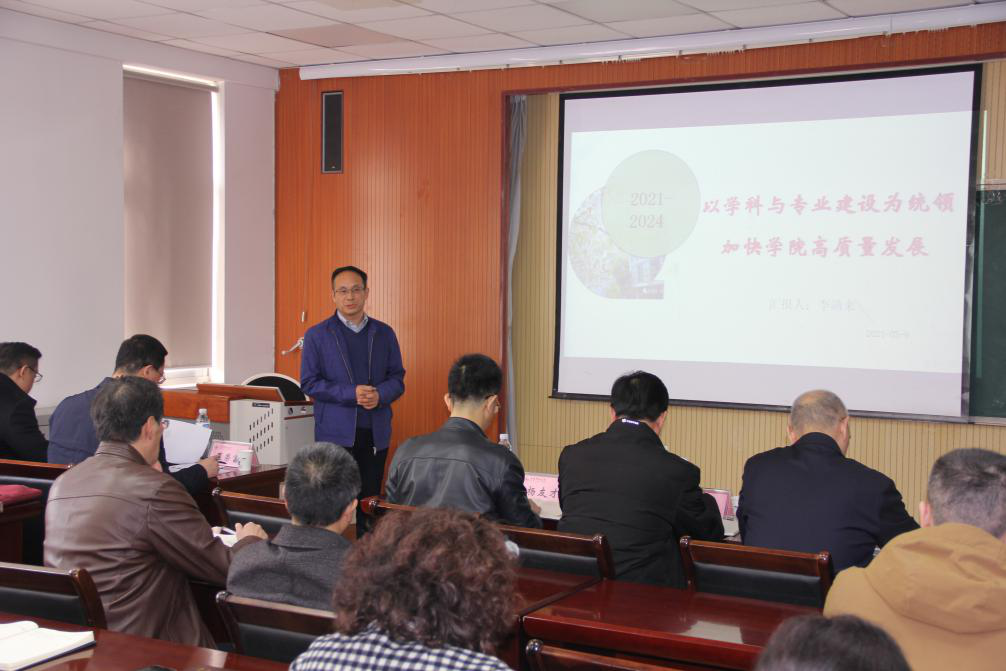 会上,院长李勋来作《以学科专业建设为统领,加快学院高质量发展》的报告。李勋来从专业设置、学位点建设、师资队伍力量等方面介绍了9001jcc金沙以诚为本基本情况,以各系业绩分布、各类业绩占比等数据为支撑分析上聘期教学科研状况,并深入剖析学科专业建设的瓶颈,从四个方面对未来工作方向做出规划。