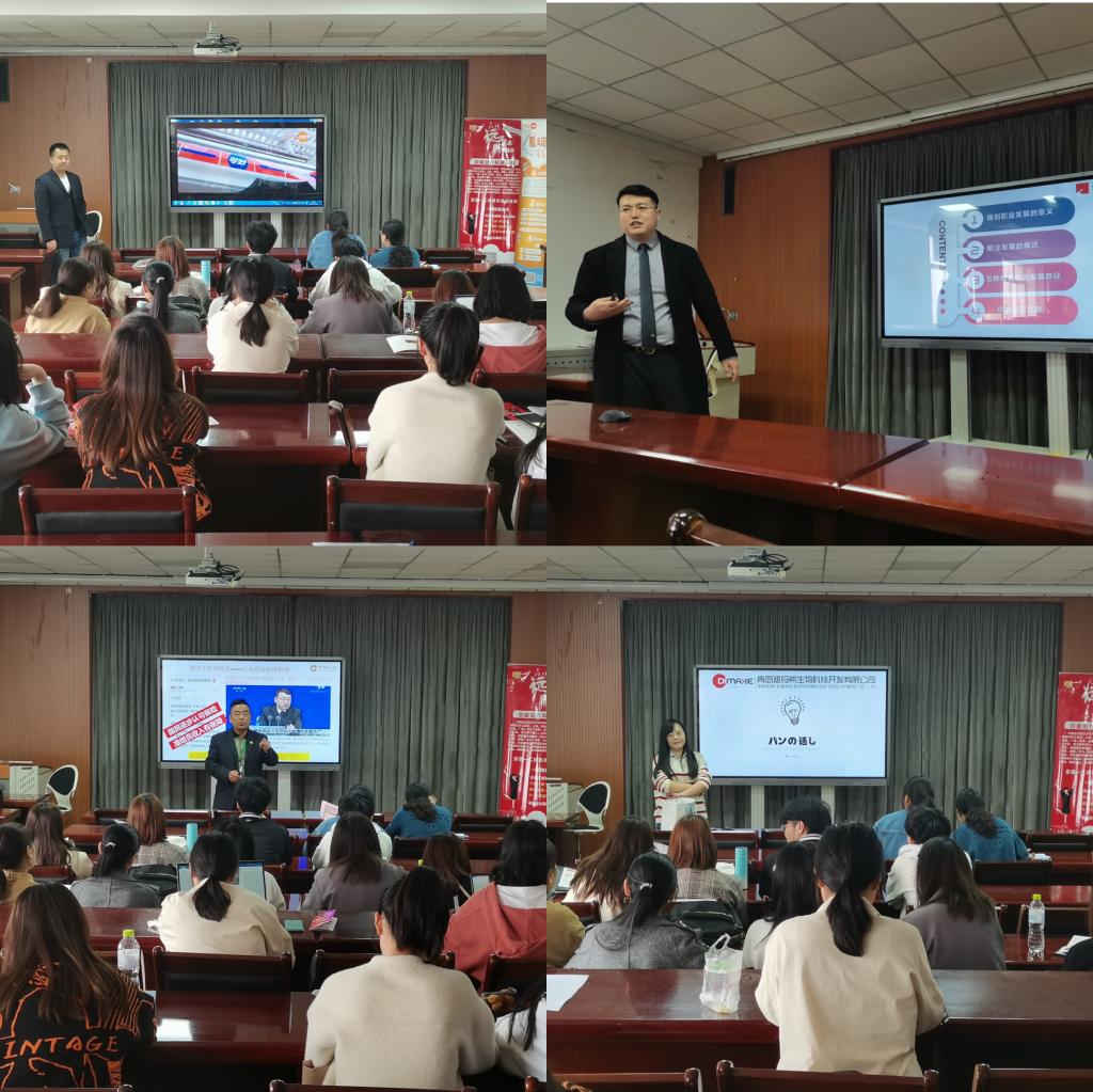随后,中国远行地产为同学们进行了职业规划和岗位面试的培训,中国人寿保险股份有限公司青岛分公司市南支公司、青岛迪玛希生物科技开发有限公司、青岛可好便利店管理有限公司依次做招聘宣讲,从公司发展、招聘岗位、薪资待遇等方面做了详细介绍并现场解答了同学们提出的问题。