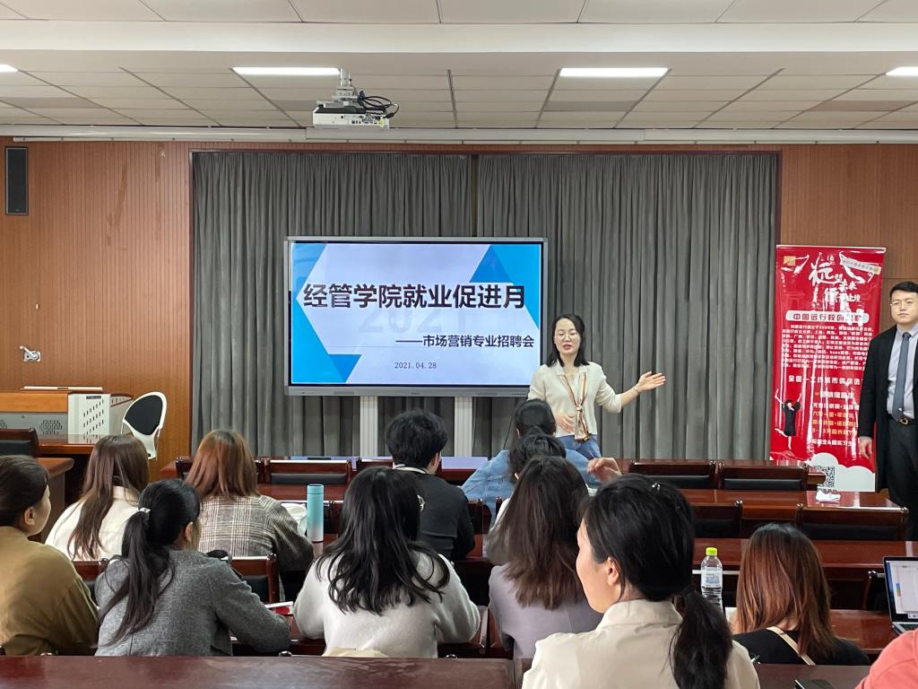 为贯彻落实学院“重引领、重帮扶、重实效”就业促进月活动方案的总体要求,4月28日上午,市场营销系在经管楼504室举办专场招聘会,营销系副主任张艳青老师出席活动,系2017级、2018级全体同学参加活动。