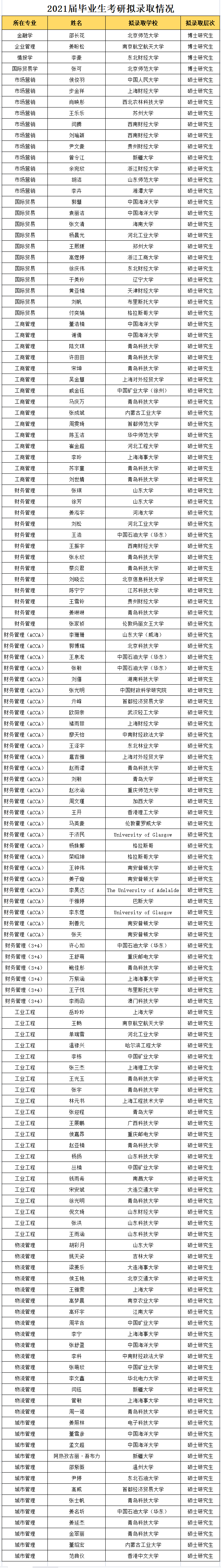 2021年全国硕士研究生录取工作接近尾声,在学院领导和老师的关心、指导以及同学们的不懈努力下,9001jcc金沙以诚为本捷报频传,截至目前,学院2021届硕士研究生有4人成功考取博士研究生,2021届本科生中有134人被中国人民大学、山东大学、上海财经大学等知名高校录取为硕士研究生,本科生总体升学率达26.43%(国内升学率22.68%)。升学录取名单如下: