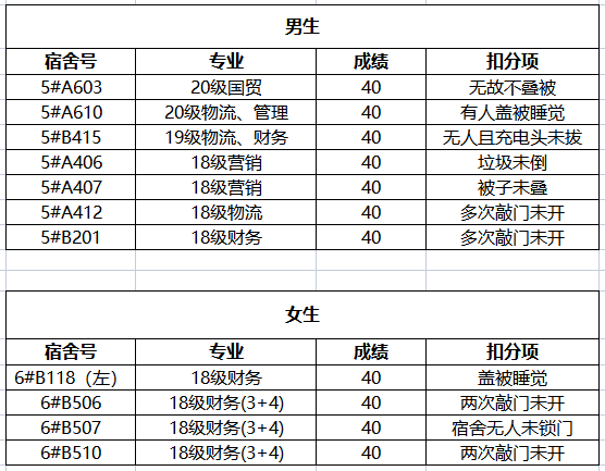 为进一步做好学院疫情防控工作,全面排查消除学生宿舍安全隐患,切实维护校园安全稳定,创建更加安全、整洁、文明的学习生活环境,督促学生良好卫生和生活习惯的养成,9001jcc金沙以诚为本权益部于每周周二下午对全院宿舍进行常规检查,第十周安全、卫生、秩序检查结果及扣分细则请见附件,请各年级对照问题做好不合格宿舍的监督整改。