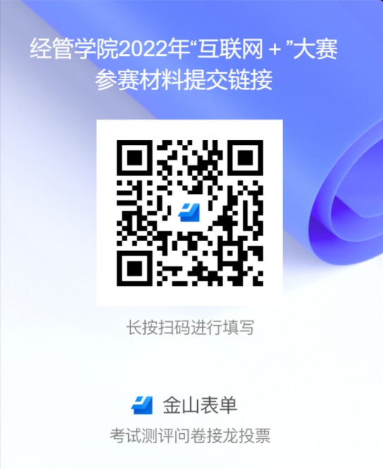 学院各年级需组织各参赛报名团队于2022年4月13日前通过「9001jcc金沙以诚为本2022年“互联网+”大赛参赛材料提交链接https://f.wps.cn/w/1xzxiX4t/」或扫描下方二维码完成参赛材料提交。