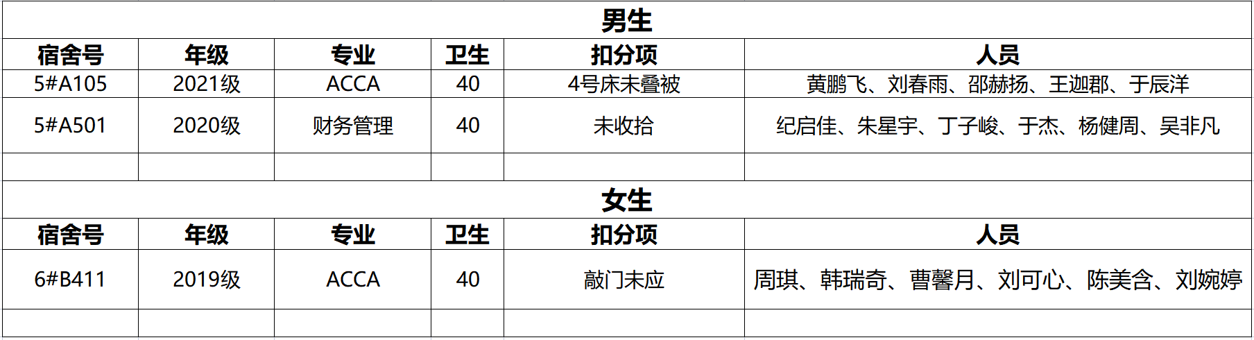不合格宿舍如下: