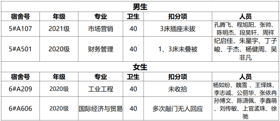 为进一步做好学院疫情防控工作,全面排查消除学生宿舍安全隐患,切实维护校园安全稳定,创建更加安全、整洁、文明的学习生活环境,督促学生良好卫生和生活习惯的养成,9001jcc金沙以诚为本权益部于每周周二下午对全院宿舍进行常规检查,第三周检查情况如下: