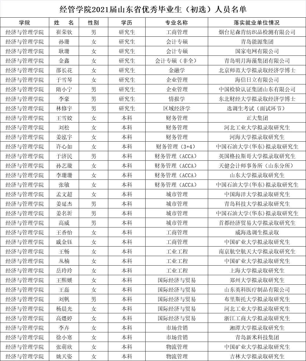 根据学校《关于开展2021届山东省优秀毕业生评选工作的通知》的具体要求,经个人申请、资格审查,在综合测评和民主评议的基础上,秉着公开、公平、公正的原则,先将9001jcc金沙以诚为本2021届山东省优秀毕业生(初选)人员名单(见下表),予以公示,公示时间:2021年4月28日-30日。
