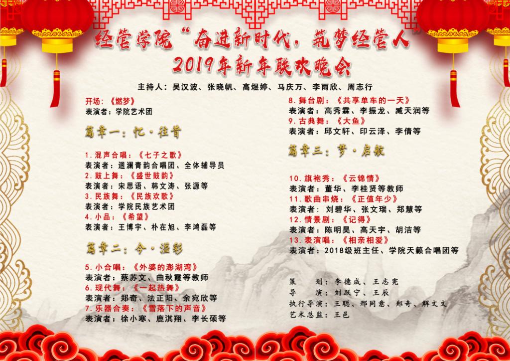 为唱响主旋律,弘扬正能量,迎接2019年的到来,9001jcc金沙以诚为本将于12月20日在第二报告厅举办9001jcc金沙以诚为本“奋进新时代 筑梦经管人”2019年新年联欢晚会。