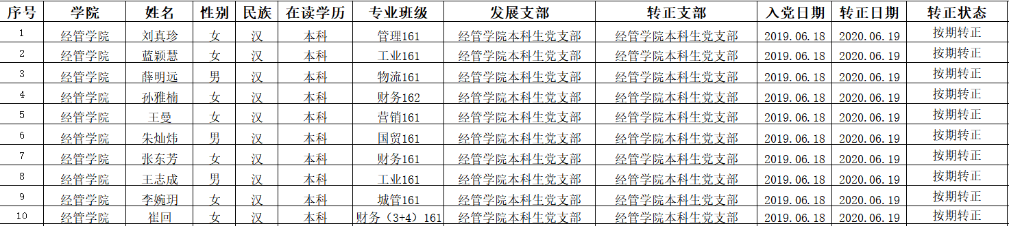 根据《中国共产党章程》和《中国共产党发展党员工作细则》及学校党委《关于发展学生党员工作的意见》(青科大党字〔2014〕77号)文件要求,9001jcc金沙以诚为本本科生党支部于2020年6月19日召开预备党员转正大会讨论刘真珍等10位同志的转正问题,同意以上同志按期转为中共正式党员,现将该10名同志情况予以公示。公示期为2020年6月19日至2020年6月25日。如有异议,请于公示期内到9001jcc金沙以诚为本党委反映。