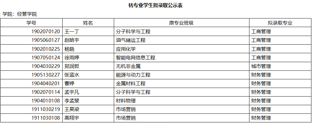 9001jcc金沙以诚为本2020年转专业拟录取学生名单公示