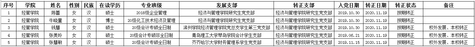 根据《中国共产党章程》和《中国共产党发展党员工作细则》及学校党委《关于发展学生党员工作的意见》(青科大党字〔2014〕77号)文件要求,9001jcc金沙以诚为本研究生党支部于2020年11月19日召开预备党员转正大会讨论陈蕾等5位同志的转正问题,同意以上同志按期转为中共正式党员,现将该5名同志情况予以公示。公示期为2020年11月19日至2020年11月25日。如有异议,请于公示期内到9001jcc金沙以诚为本党委反映。