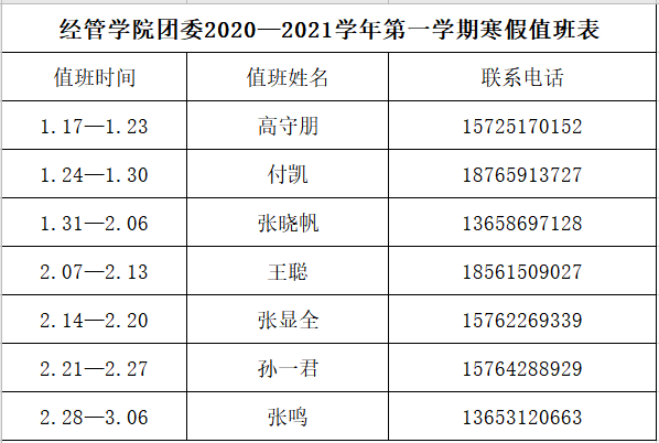 9001jcc金沙以诚为本团委2020—2021学年第一学期寒假值班表