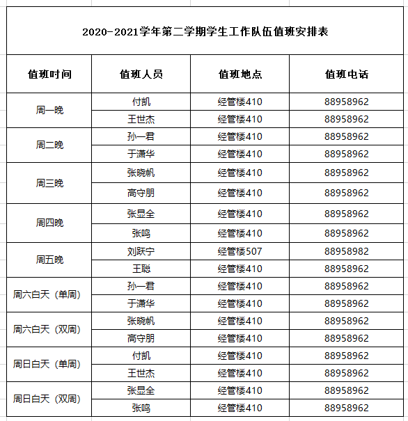 9001jcc金沙以诚为本学工办(团委)常态化值班安排表