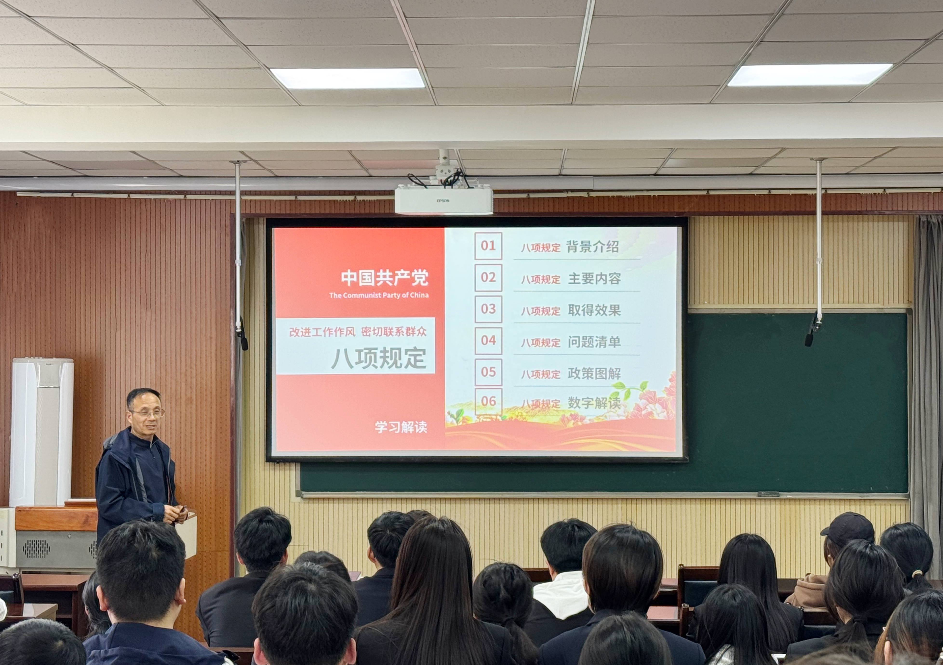 为深入贯彻中央八项规定精神学习教育,巩固深化主题教育成果,纵深推进全面从严治党,4月15日,学院党委书记李勋来为春季学期新发展入党积极分子和发展对象讲授“深入学习贯彻中央八项规定精神”学习教育专题党课,扣好入党的“第一粒扣子”。