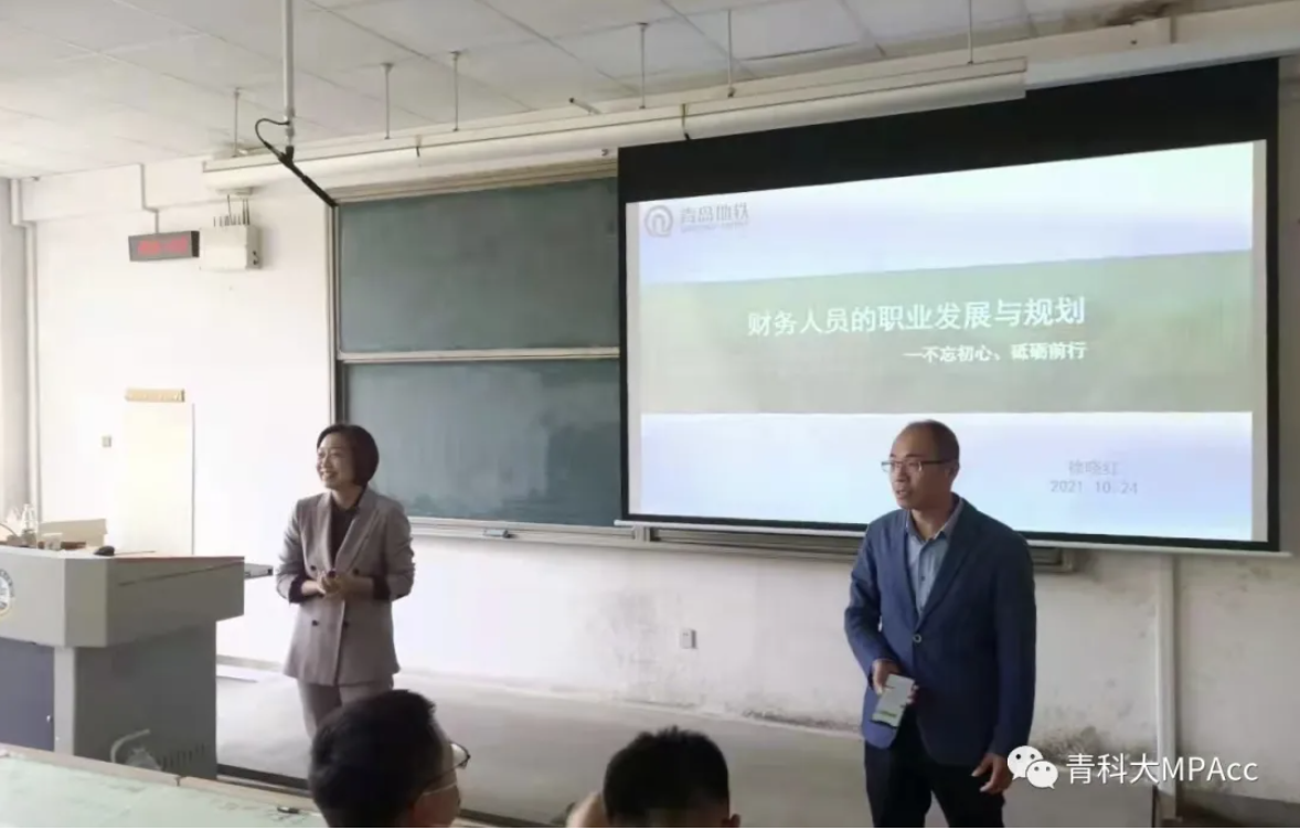 2021年10月24日上午,青岛地铁集团公司副总会计师、青岛地铁金融控股公司董事长、青岛地铁商贸公司董事长、我校会计硕士校外导师徐晓红女士莅临9001jcc金沙以诚为本,为2021级会计专硕研究生举办了题为《财务人员的职业发展与规划》的主题讲座,报告会由MPAcc教育中心主任于培友老师主持,金沙官网2021级会计专硕研究生聆听了此次讲座。讲座围绕财务人员发展阶段及未来前景等方面展开。