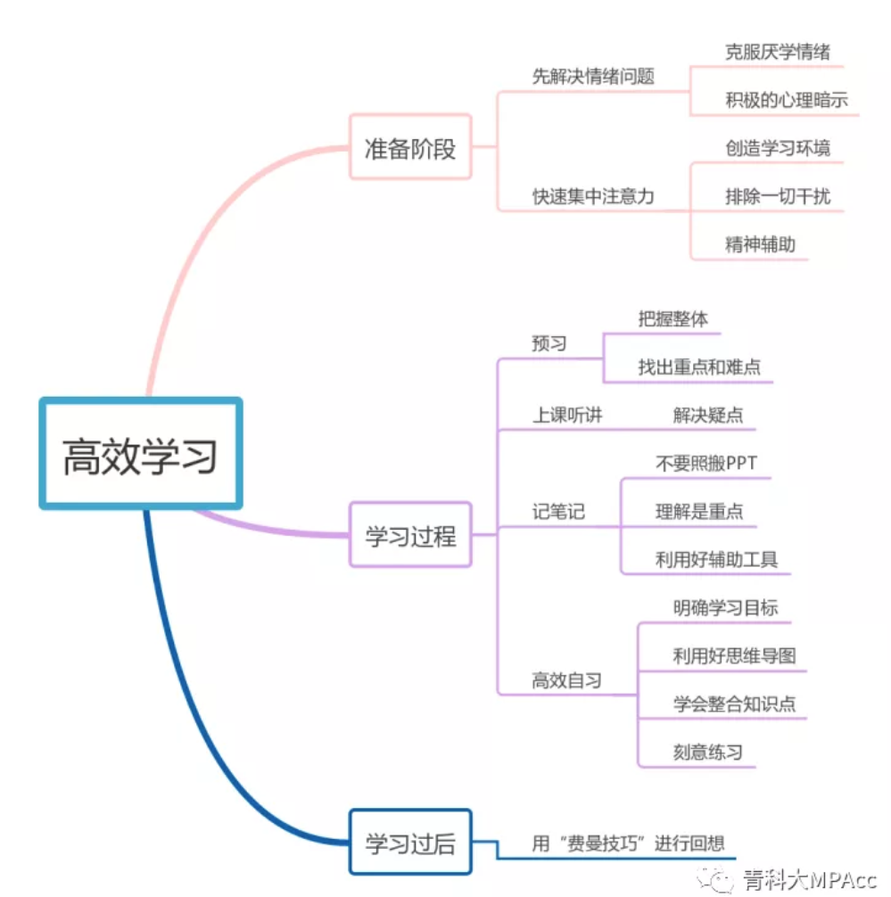 掌握和运用一些方法来提高学习效率、工作效率,就会充分有效地利用好有限的时间,最大程度地缓解学习与工作的矛盾。学习过程中,要善于在学习中寻找适合自己的学习方法,提高单位时间的效率。工作过程中,要提高效率,办事不拖沓、不敷衍。对于如何高效学习,我想以思维导图的形式和大家分享一下我的方法。