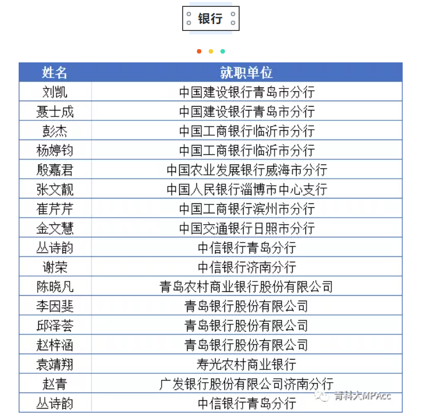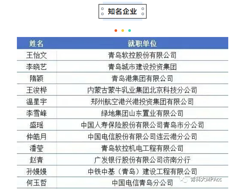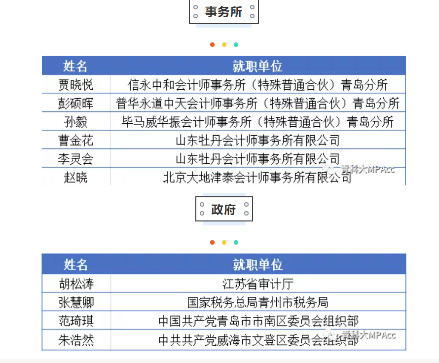 9001jcc金沙以诚为本MPAcc教育中心贯穿以人为本的教育理念,全员育人、全方位育人,毕业学生大多进入知名企业、银行、事务所或者政府等。部分优秀校友的就业去向如下: